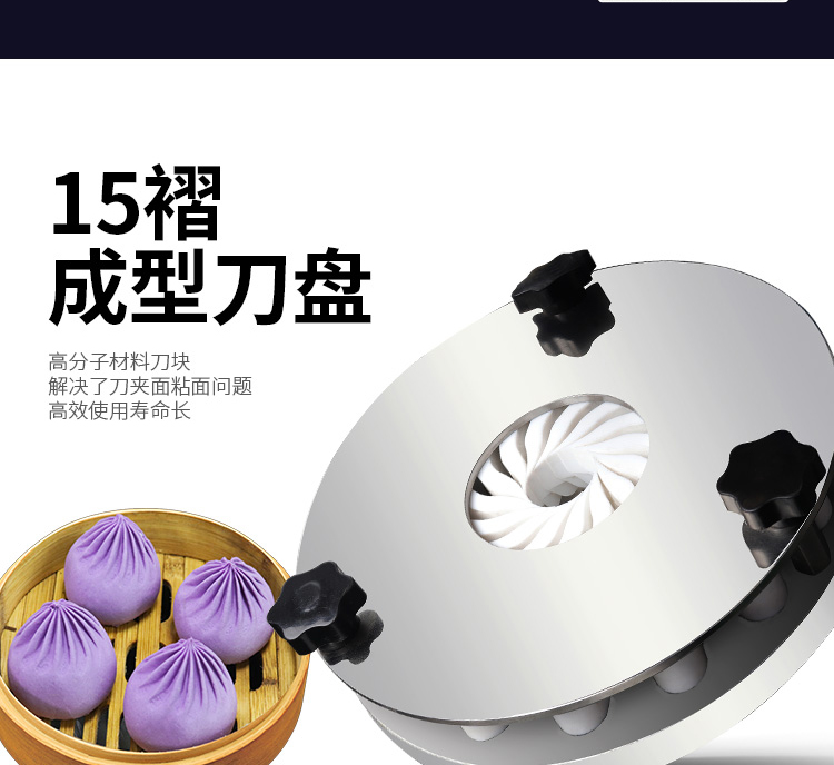◆包子成型系統(tǒng):采用成型盤垂直上下移動(dòng),配合刀塊張合防止以前包子機(jī)做大包子成型堵面的現(xiàn)象。15塊進(jìn)口高分子材料刀塊充分利用力學(xué)原理均衡受力減小摩擦,完善了其它包子機(jī)成型刀塊靠一塊主刀推動(dòng)其它14塊副刀運(yùn)動(dòng)易磨損,刀夾面粘面,易受天氣變化而熱脹冷縮不能正常生產(chǎn)的難題。生產(chǎn)穩(wěn)定大大延長(zhǎng)成型刀塊使用時(shí)間。