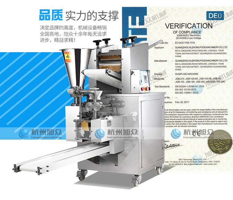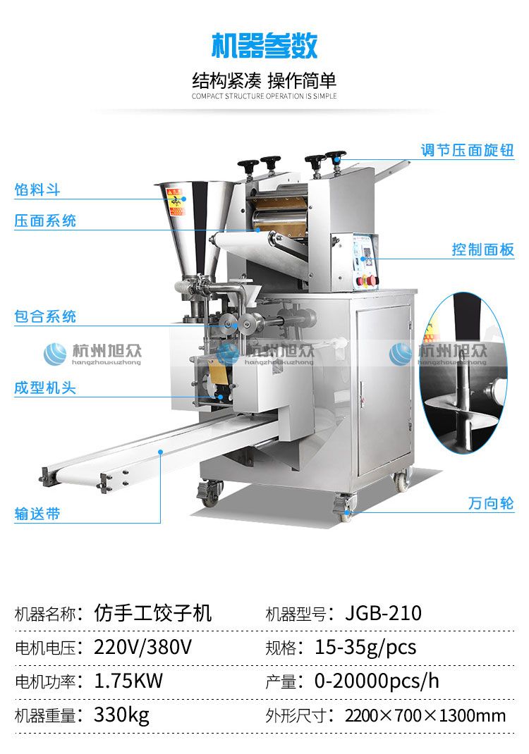 旭眾牌JGB-210型仿手工餃子機(jī)是我公司研發(fā)生產(chǎn)的先進(jìn)自動餃子生產(chǎn)設(shè)備。本機(jī)采用自動壓面皮包餃子的新工藝技術(shù),克服了舊式餃子機(jī)絞龍強(qiáng)力擠壓而帶來的對面筋的損傷,面團(tuán)不會發(fā)熱,不會糊化,餃子口感佳。