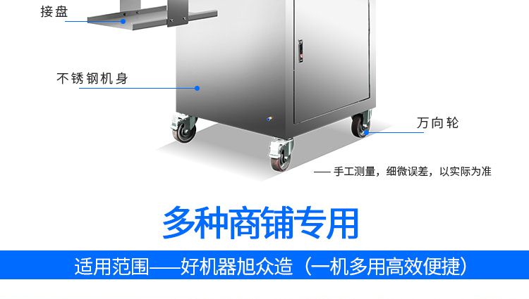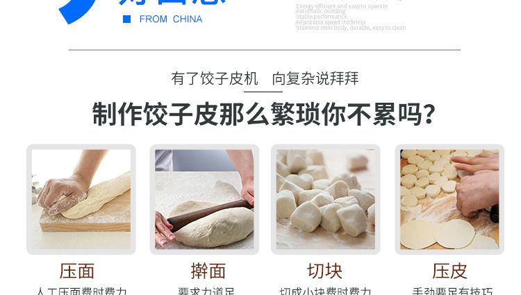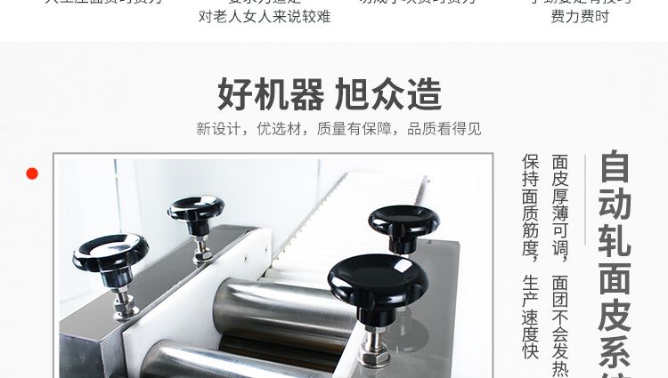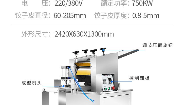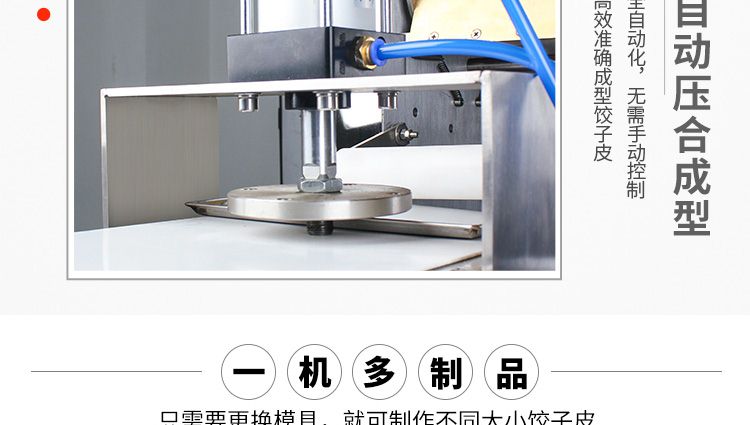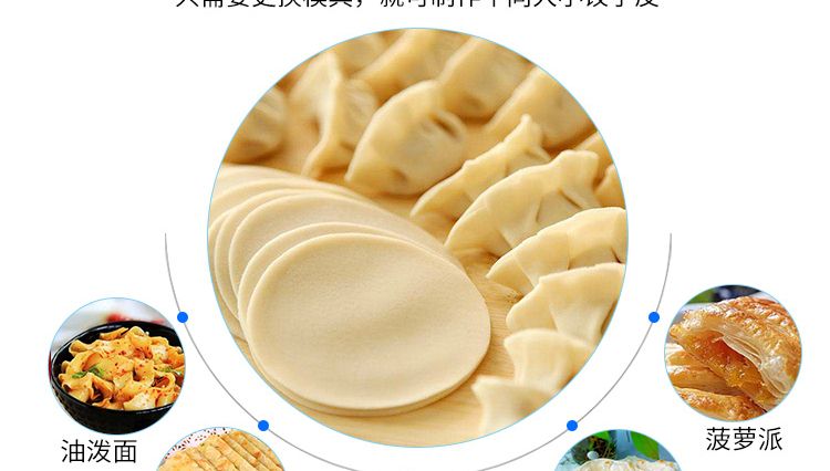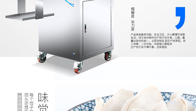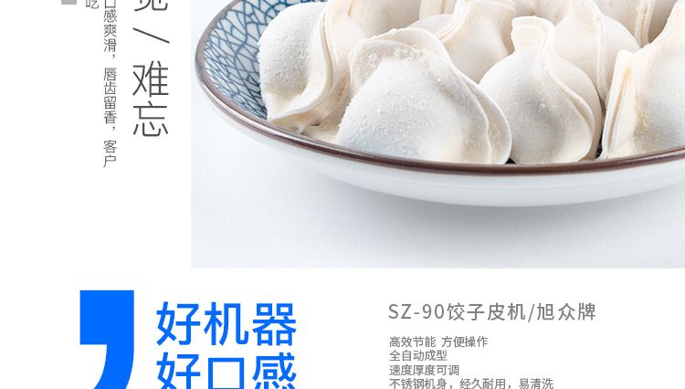 JGB-90型餃子皮機是我公司開發(fā)生產(chǎn)的先進餃子皮生產(chǎn)設備。可以簡單更換模具(可根據(jù)客戶定制不同形狀、尺寸的模具),本設備采用氣缸運動。本廠生產(chǎn)的90餃子皮機,采用多道壓面輥壓面,壓面效果優(yōu)異,壓出的面皮筋道,進一步提高所包出的餃子口感。