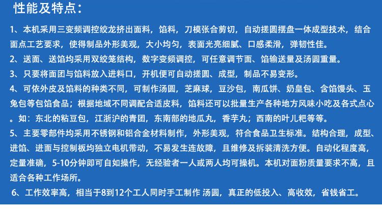 本機工作效率高,對面粉質量要求不高,適合各種工作場所。本機提供免費上門培訓指導、安裝、調試、面點工藝傳授。