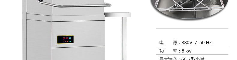 旭眾牌XZ-60揭蓋式洗碗機板材采用標1.2mm厚不銹鋼板,主骨架均為國標1.5不銹鋼管,底座鋼板為6mm,進出口傳動軸均為304#不銹鋼材質;水泵為意大利進口水泵(國標15米揚程)不銹鋼食品泵,電器采用知名品牌正泰電器,篩網(wǎng)為激光沖孔。揭蓋式洗碗機主要針對小碗、小碟、杯子類餐具。