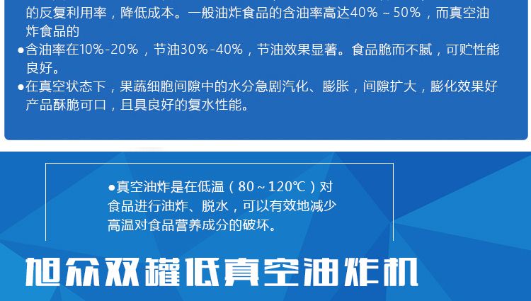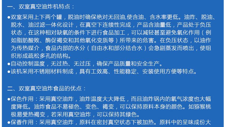 ●真空油炸是在低溫(80~120℃)對食品進行油炸、脫水,可以有效地減少高溫對食品營養(yǎng)成分的破壞。