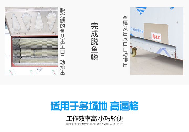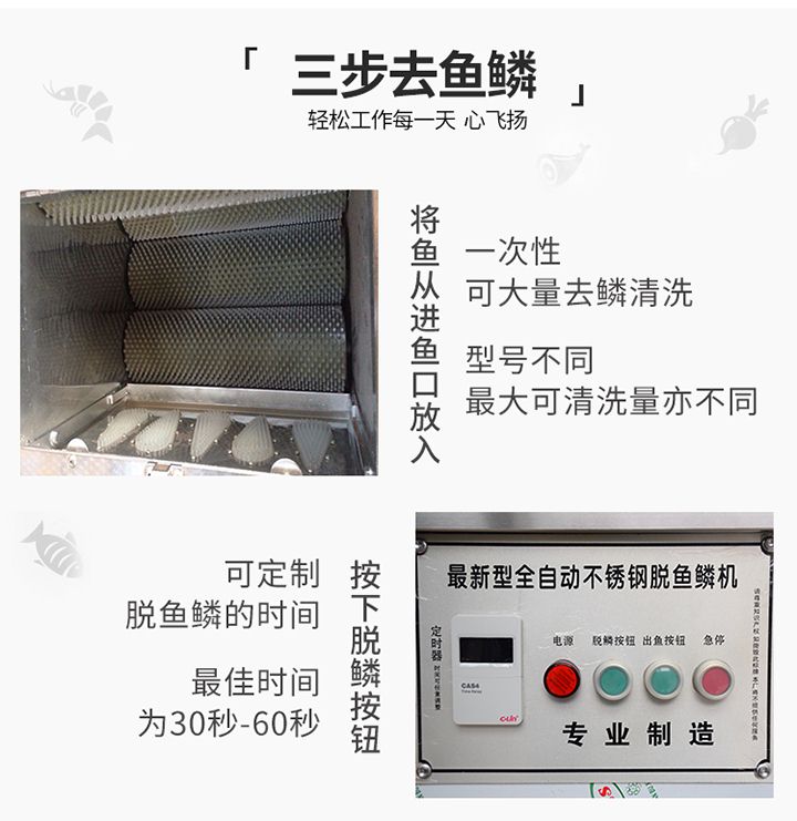 自動魚鱗機廣泛應用于魚類銷售市場、飯店、魚類加工廠等等,本產(chǎn)品不會對魚頭、魚尾、魚鰭造成損傷。該機器利用旋轉(zhuǎn)效應,使魚在運動中去鱗,去鱗干凈,對魚的加工去鱗屬國內(nèi)外首創(chuàng),主要指標達到國際先進水平。
