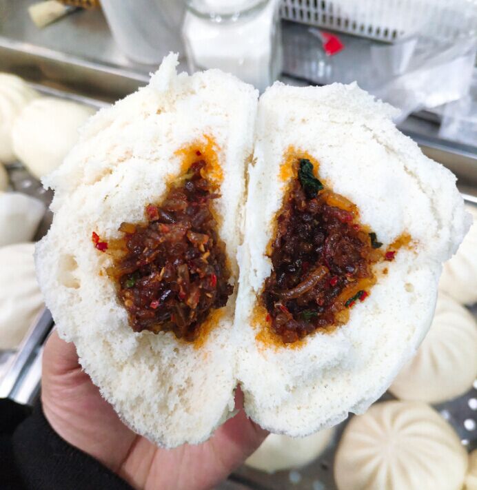 機器制作香辣粉絲包,先和好面團(可手工揉面或和面機和面),拌好餡料(手動拌餡或拌餡機拌餡),放入包子機對應的面斗和餡斗中,皮餡比例調好后開啟開關制作成香辣粉絲包子,如下圖: