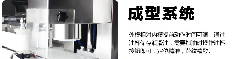 旭眾牌SZ-64型月餅自動(dòng)成型機(jī)是一款多功能的設(shè)備,其具備的功能有:月餅計(jì)數(shù)、數(shù)字清零、月餅位置定位、月餅花紋深度調(diào)節(jié)、外模對(duì)內(nèi)模提前動(dòng)作時(shí)間調(diào)節(jié)以及成型時(shí)輸送帶延時(shí)時(shí)間調(diào)節(jié)。